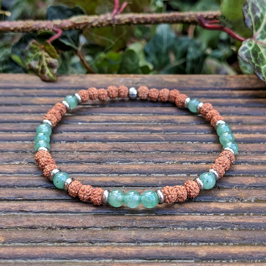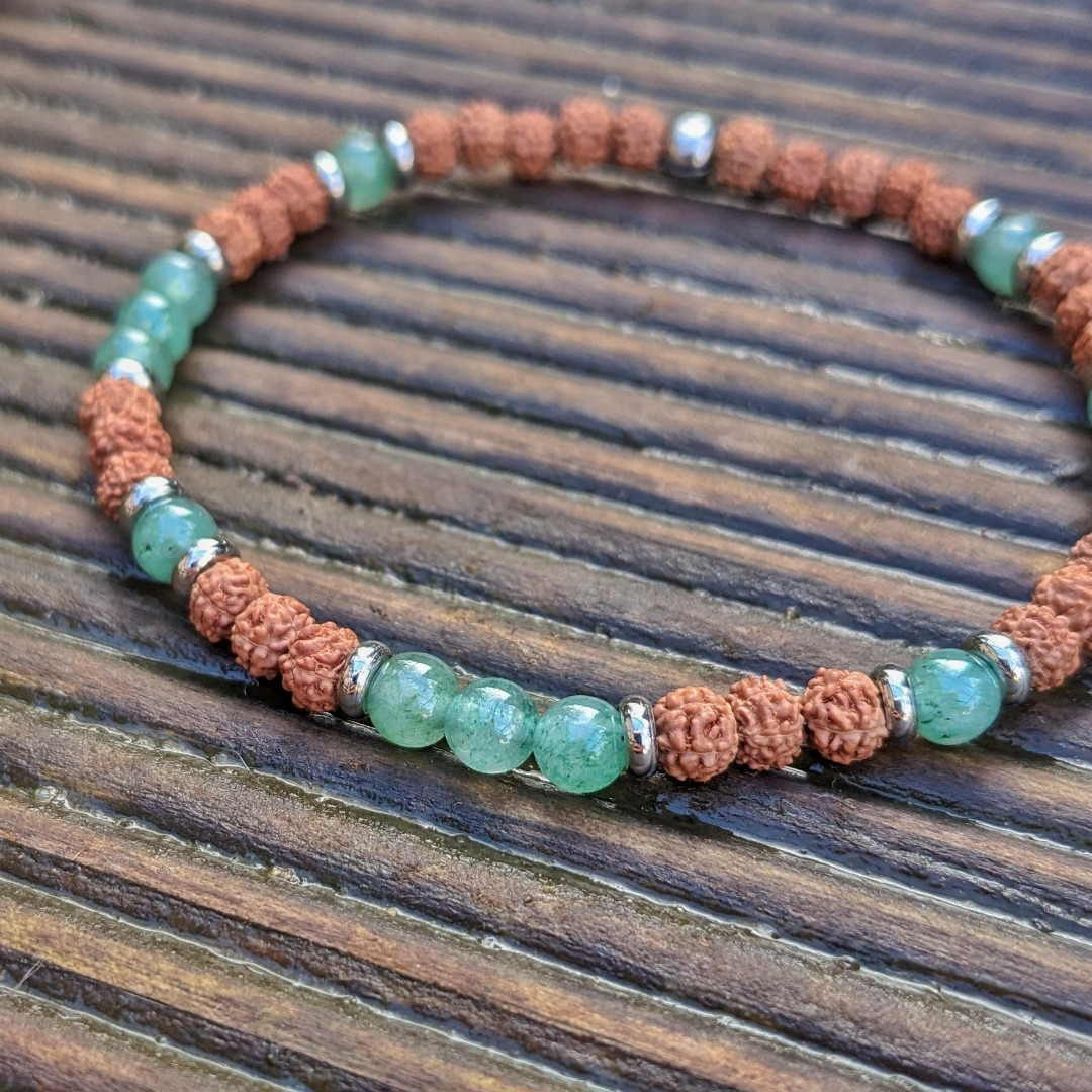 Náramek z minerálního kamene zeleného avanturínu a rudraksi jako symbol ochrany a štěstí.
